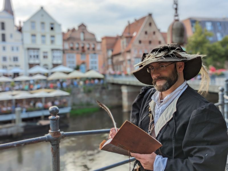 Sind alle Güter von Bord? Ist die Qualität wie erwartet? Was gibt es für neue Nachrichten aus Skandinavien? Als Kaufmannsgehilfe hat man sich um viele Dinge zu kümmern, worauf der Chef keine Lust hat... Aber sei es drum, das bedeutet nicht, dass man nebenher keinen Spaß haben kann. Lassen Sie sich auf einen kleinen Rundgang durch eines der schönsten Viertel Lüneburgs mitnehmen und lernen Sie das pulsierende Herz der alten Hansestadt Lüneburg kennen: Den historischen Hafen und seine nähere Umgebung. Natürlich hält Florian dabei auch einiges an Seemanns-... Pardon! Kaufmannsgarn für Sie bereit, das würde ja sonst keiner aushalten.