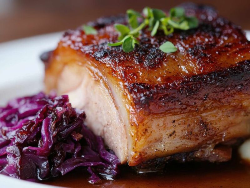 • Hauptspeise: Schweinebraten (vegetarisch: Rahmchampignons) mit Spätzle, Blaukraut & glasierten Karotten