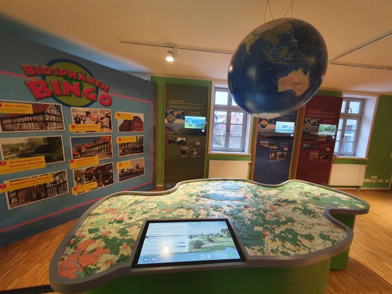 Über einen interaktiven Bildschirm können Sie zahlreiche touristische und naturräumliche Besonderheiten des Biosphärenreservates abrufen. Die Lage dieser Standorte wird auf dem Modell mittels LED-Leuchtpunkten visualisiert. Die einzelnen Punkte werden dann über den interaktiven Bildschirm durch zusammenfassende Kurzinformationen beschrieben. Über dem Modell schwebt eine Erdkugel, auf der die weltweite Verteilung der rund 600 Biosphärenreservate zu sehen ist. Das Biosphärenreservat niedersächsische Elbtalaue wird dabei besonders hervorgehoben.