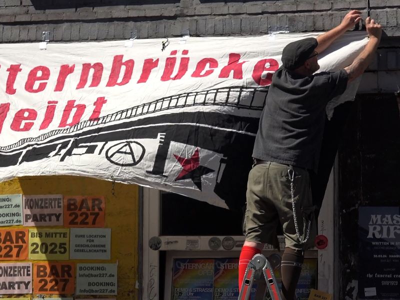 „Wenn du magst, kannst du kurz hier tanzen“ steht an der Wand der geschlossenen Astra-Stube und eröffnet einen Bordstein-Klub, der zum Cornern am Verkehrskreisel einlädt. Eine Band tritt auf – umsonst und draußen – gefolgt von einer politischen Rede mit aktuellen Infos der Initiative Sternbrücke.