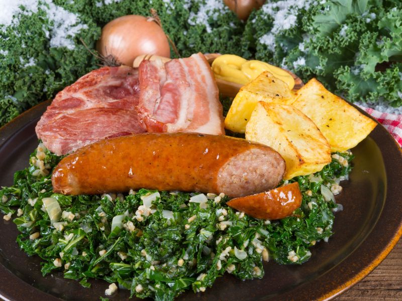 Es gibt Grünkohl mit Kassler und Kochwurst und dazu Kartoffeln. Auch eine vegane Variante ist möglich (bitte bei der Anmeldung Bescheid sagen!).