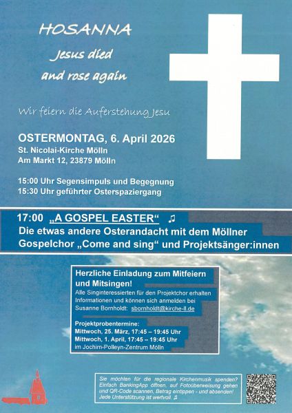 17.00 Uhr „A GOSPEL EASTER“ die etwas andere Gospelandacht mit dem Möllner Gospelchor „Come and Sing“ und Projektsänger:innen