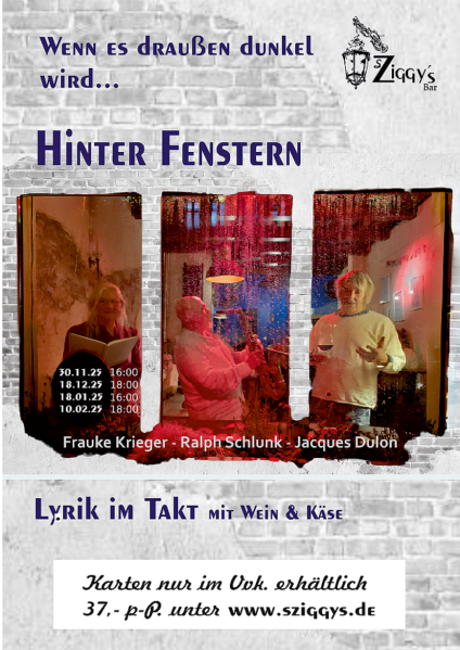 Am Sonntag, den 30. November 2025, findet um 16 Uhr in der sZiggys Bar in Lübeck die erste Lesung der neuen Veranstaltungsreihe "Hinter Fenstern" statt.