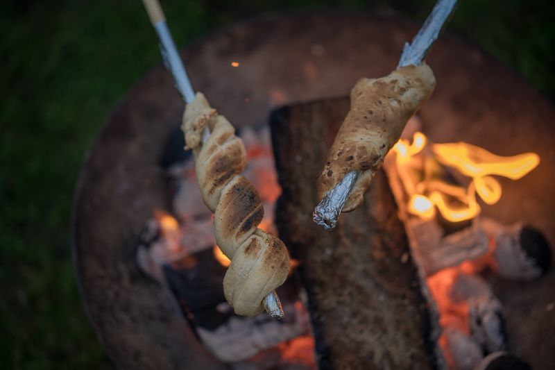 Entdecken Sie das Vergnügen eines Lagerfeuers mit Stockbrot, eine gemütliche Familienaktivität, die Naturgenuss und kulinarisches Erlebnis verbindet.