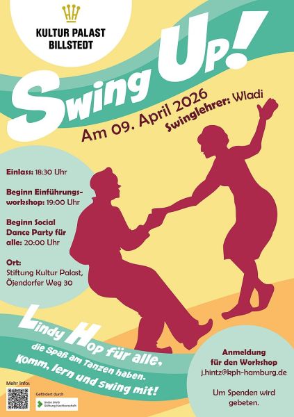 Lindy Hop im Kultur Palast Billstedt – am 9. April 2026 wird es swingend! Zu mitreißender Swingmusik tanzen wir gemeinsam durch den Abend, egal ob als erfahrene Leader und Follower oder neugierige Neueinsteiger*innen. Vor dem Social Dance findet ein Crashkurs mit Swinglehrer Wladi statt, damit alle gut ins Swing-Feeling kommen. Ein Abend ganz im Stil der goldenen Swing-Ära.