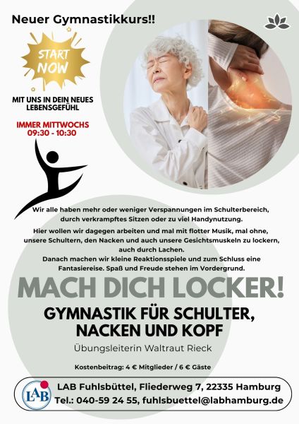 Hier wollen wir dagegen arbeiten und mal mit flotter Musik, mal ohne, unsere Schultern, den Nacken und auch unsere Gesichtsmuskeln zu lockern, auch durch lachen.