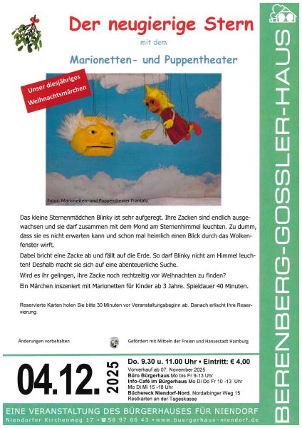 Weitere Informationen über das kleine Sternenmädchen Blinky und ihre Zacken die ausgewachsen sind, ihre Ungeduld endlich am Sternenhimmel mit dem Mond zu leuchten, entnehmen Sie bitte dem anliegenden Plakat.