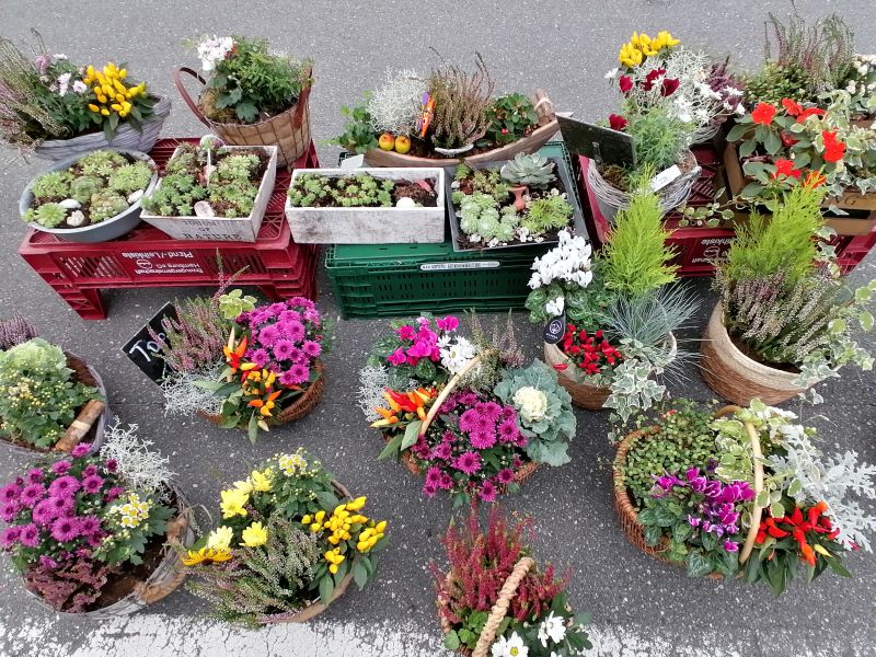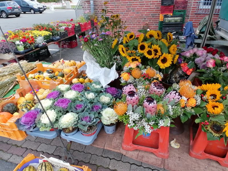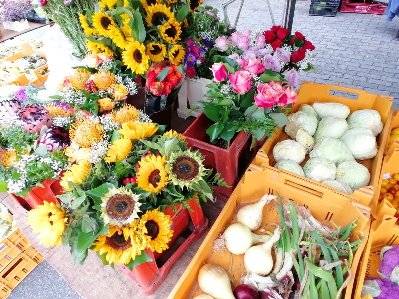 eine bunte Auswahl an verschiedenen Schnittblumen und Pflanzen sowie frisches, regionales Gemüse an.