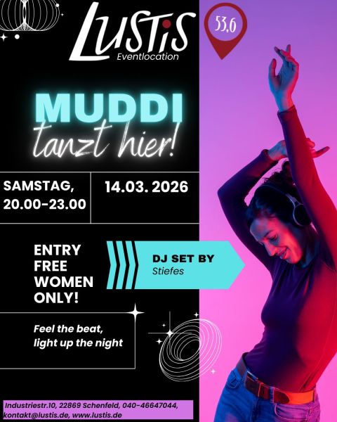 Kommt vorbei und lasst uns die Nacht zum Beben bringen! Bei „Muddi tanzt hier!“ feiern wir eine unvergessliche Party nur für Frauen. Schwingt das Tanzbein, genießt die besten Beats und lasst euch von DJ Stiefes mit den heißesten Tracks ordentlich einheizen!