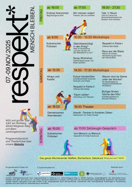 Mensch bleiben. Das ist das Motto des diesjährigen respekt* Wochenendes - drei Tage zwischen Reflexion und Zuversicht, zwischen Dystopie und Utopie. Vom 7. bis 9. November öffnen wir Räume für Begegnung, Gespräch, Kunst, Haltung und Zukunftsfragen.