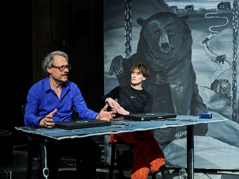 Im Winter 2023 reist das Performance-Kollektiv les dramaturx gemeinsam mit der mazedonischen Autorin Ana Trpenoska in den nordmazedonischen Mavrovo-Nationalpark zu einer der größten freilebenden Bärenpopulationen Europas. In Nordmazedonien, EU-Beitrittskandidat, werden die Reisenden mit einer Reihe politischer, sozialer und kultureller Probleme konfrontiert. Viele der durch EU-Programme geschützten und geförderten Bären finden infolge der Klimakrise nicht mehr in ihren natürlichen Winterschlaf. Sie bleiben wach und durchstreifen auf der Suche nach Nahrung die nordmazedonischen Wälder. Trotz der höheren Temperaturen ist Nahrung für die Tiere im Winter äußerst knapp – ihre Insomnie durchbricht den natürlichen Kreislauf. Das nordmazedonische Dorf, in dem die deutschen Theatermacher*innen sehr gastfreundlich empfangen werden, wird von 20 hungrigen Braunbären belagert, deren Abschuss und/oder Vertreibung bei hoher Strafe verboten ist. les dramaturx sprechen mit Anwohner*innen, Politiker*innen, lokalen Umweltschützer*innen. Es geht um Religion, Korruption, Müllexport, Klimaschutz und das Überleben in den Ruinen des Kapitals. Ana Trpenoskas Stück beruht auf Gesprächen und Recherchen vor Ort. Auch die Situation des von zwei Dutzend Braunbären belagerten Dorfes ist ganz real. In »Tag der Bären« kollidieren westeuropäische Vorstellungen über Klima- und Artenschutz, über Zeit und Zukunft, mit den ganz realen Verhältnissen eines östlichen EU-Beitrittskandidaten.