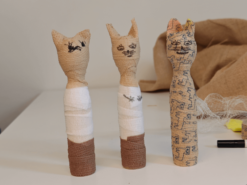 Off to ancient Egypt: Mystical cat mummies are created from old cones and bandages! The mummies can then be painted and decorated.