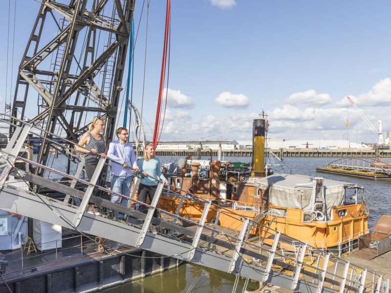 The pontoon bridge provides access to the steam dredger SAUGER IV from 1909 and the floating steam crane SAATSEE from 1917. Both large vessels are equipped with steam engines that are operated one weekend a month. An exhibition on the Hamburg box barge H 11347 from 1913 illustrates the work of the barge captain and life on board.