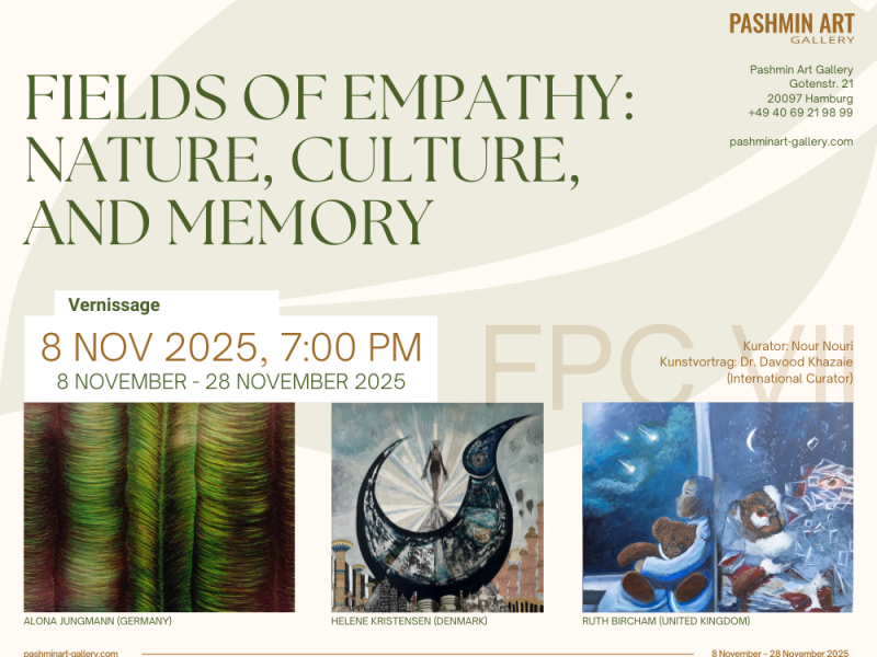 In November 2025, the Pashmin Art Gallery Hamburg presents an international exhibition in the series Feminine Power on Canvas, featuring three contemporary artists: Alona Jungmann (Germany), Helene Kristensen (Denmark), and Ruth Bircham (UK). Curated by Nour Nouri and accompanied by a lecture from Dr. Davood Khazaie, the exhibition explores how artistic creation becomes an act of transformation – from nature to abstraction, memory to architecture, pain to renewal.