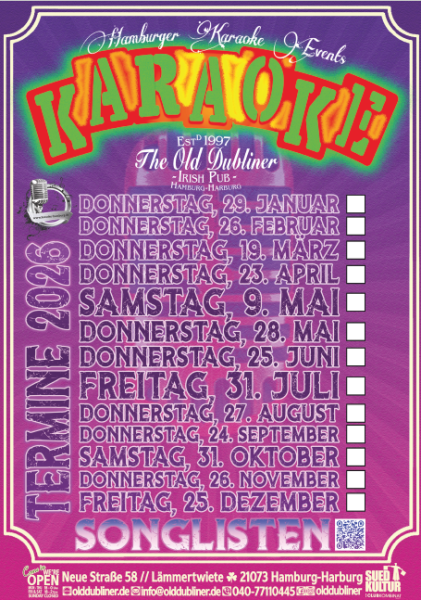 Experience the magic of Irish joie de vivre on our karaoke stage! Let yourself be carried away by the enchanting sounds of the Emerald Isle and immerse yourself in an unforgettable experience. Sing with passion and dedication as you feel the freedom of music in the warm, welcoming atmosphere of the Old Dubliners. Everyone is welcome here, whether you're a professional singer, an amateur, or a complete novice :-D We celebrate the moment and every performance is met with frenetic applause. It's no coincidence that the Old Dubliners' motto is: “There are no strangers here, only friends you haven't met before!” Our hosts speak German and English.