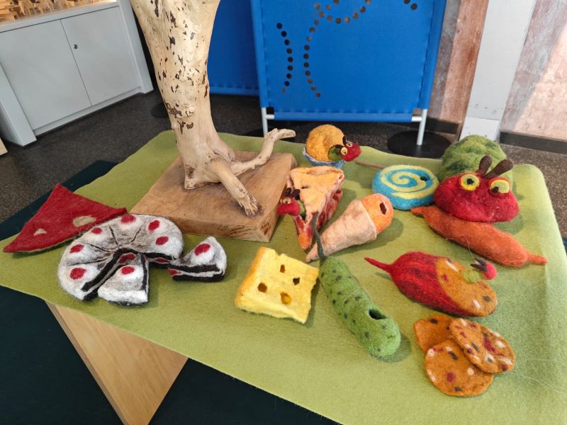 Who doesn't know it? The Very Hungry Caterpillar. In keeping with the "KiBuFi" (Children's Book Meets Felt) exhibition, children from the choir profile of grades 1-3 at the GOBS Neuenkirchen and from the children's choir of the St. Bartholomäus Parish in Neuenkirchen, under the direction of Anke Heusler, will sing songs about The Very Hungry Caterpillar, a story by Pippi Longstocking, and a story by Emil from Lönneberga. Margrit Schafranek will read selected texts, which the children can follow as a picture-book cinema.