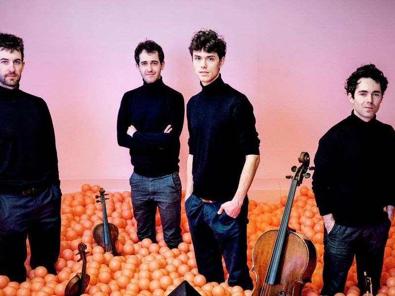 Finally back as guests of the Kammermusikfreunde: the young »iconoclasts« play Mozart’s first »Prussian« quartet and Shostakovich’s String Quartet No. 7 entirely from memory, using their freedom from music stands to deliver an even more intense, highly expressive performance. And the second half of their programme does not follow the rules of classical concert performance at all: surrounded by lighting and sound technology, the four young musicians play new pieces from their new album »In the Fields«, which they composed and arranged themselves. Special guest: Iranian composer and guitarist Mahan Mirarab, who builds a unique bridge between Persian musical tradition and contemporary European chamber music. Inspired by folk, pop, rock, funk, minimalist and singer-songwriter music, the five embark on a journey to find their very own sound. With four string instruments plus a double-neck guitar, they create a world of sound full of surprises. A musical adventure beyond classical music, inspired by personal experiences and subtle impressions of different cultures.