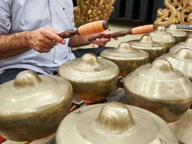 Gamelan music originated many centuries ago on the islands of Bali and Java. It is played jointly on gongs, metallophones and drums. Its unique soundscape already captivated composers such as Claude Debussy and also still has a lot of fans in Europe today. The Elbphilharmonie has a particularly beautiful ensemble of instruments. In this workshop, you can try out these instruments with guidance – and experience how spellbinding it sounds when everyone plays together.