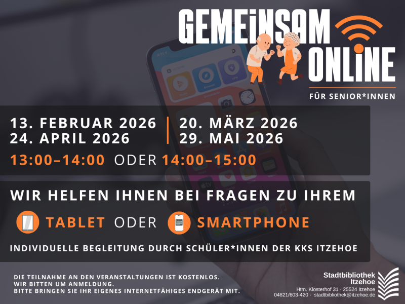 Die Stadtbibliothek Itzehoe freut sich, in Zusammenarbeit mit der Kaiser-Karl-Schule (KKS) Itzehoe das Angebot „Gemeinsam Online“ für Senior*innen weiterzuführen zu können.