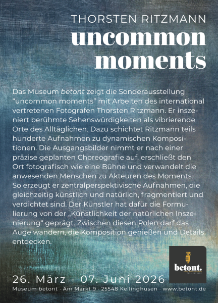 Vom 26. März bis zum 7. Juni 2026 zeigt das Museum betont die Sonderausstellung „uncommon moments“ mit Arbeiten des international vertretenen Künstlers Thorsten Ritzmann. Auf seinen Fotografien inszeniert der Künstler berühmte Sehenswürdigkeiten als vibrierende Orte des Alltäglichen. Spannend! Neu! Sehenswert!