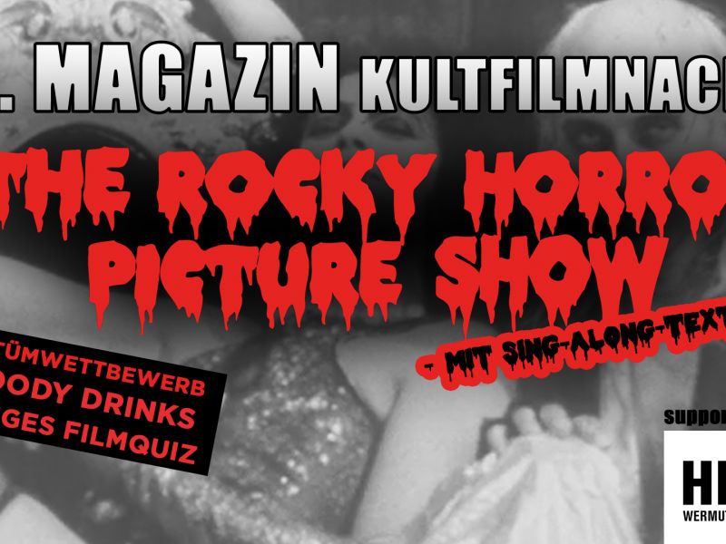 Passend zu Halloween zeigen wir bei der 9. MAGAZIN Kultfilmnacht den Klassiker „Rocky Horror Picture Show“ mit blutroten Sing-Along-Texten zum Mitsingen. Dieser Film darf in unsere Kultfilmreihe natürlich nicht fehlen, schließlich feierte der Film in den 70ern die deutsche Uraufführung bei uns! Genießt am Abend einen blutroten Longdrink mit rotem Wermut von „Helmut“ an unserer Bar. Unter allen Besucher*innen mit den kreativsten Outfits verlosen wir großartige Preise! Let’s do the Time Warp again! Tickets jetzt sichern!