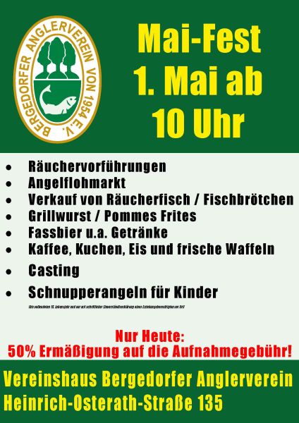 Am 01.05.2026 findet wieder das traditionelle Maifest beim Bergedorfer Anglerverein statt. Es gibt frischen Räucherfisch und diverse andere Leckereien und Getränke zu günstigen Preisen. Für Kinder die Interesse am Angeln haben wird ein Schnupperangeln unter fachlicher Anleitung der Jugendwarte angeboten. Beim Casting (Zielwerfen mit der Angel) gibt es tolle Preise zu gewinnen. Ein Angelflohmarkt rundet das Ganze ab.