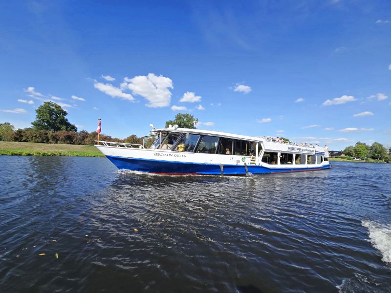 Unsere Fahrt startet im Bergedorfer Hafen am Serrahn, über den neuen und alten Schleusengraben geht es bis zur Krapphofschleuse, welche uns über einen Hub von 0,50 m auf die Dove Elbe schleust. Hier geht es vorbei an Feldern und Wiesen mit viel Grün. Wir passieren zunächst die Reitbrooker Mühle, fahren an der Allermöher Werft und den schönen Hausbooten vorbei, dem See hinterm Horn und der Allermöher Kirche bis hin zur Regattastrecke Allermöhe. Hier haben Sie weiten Blick auf die von Gänsen und Kühen bewohnten Felder. Über die Regattastrecke geht es vorbei am Eichbaumsee und bis hin zur Tatenberger Schleuse, vorbei an Yacht- und Sportboothäfen, bevor wir drehen und unseren Kurs wieder Richtung Bergedorf richten.