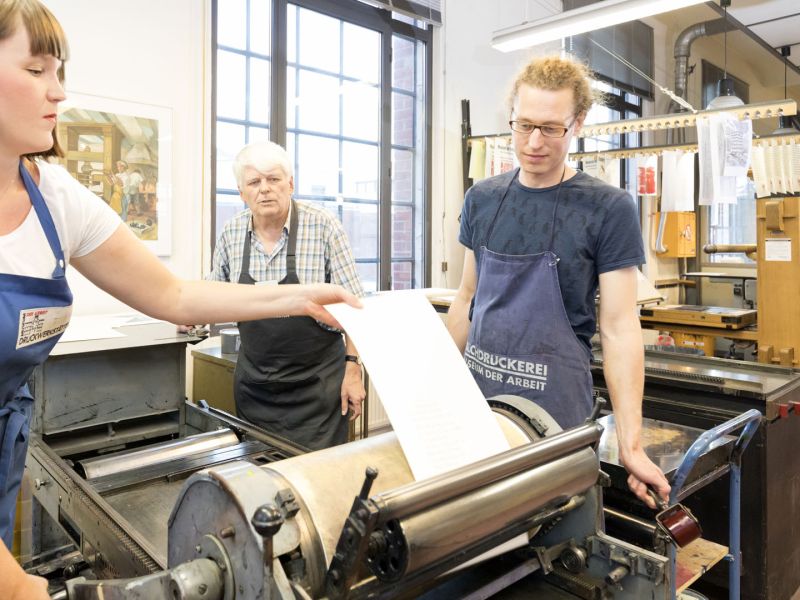 Die Abteilung Grafisches Gewerbe, konzentriert sich auf den Buchdruck, dessen Mechanisierung und Ende. Im Mittelpunkt stehen Veränderungen des Druckes mit beweglichen Lettern, eines über fünfhundert Jahre alten Verfahrens. Um diese komplexen Sachverhalte zu erhellen, einsichtig und begreifbar zu machen, wurden drei Zugangsweisen gewählt, die sich auch durch eine räumliche Dreiteilung voneinander abgrenzen: Werkstätten, in denen Setzen und Drucken in verschiedenen Verfahren vorgeführt wird, ein museumspädagogischer Bereich, in dem Besucherinnen und Besucher selbst tätig werden können, und im „Mittelschiff“ der Fabrikhalle der analysierende Zugang über das Medium Ausstellung.